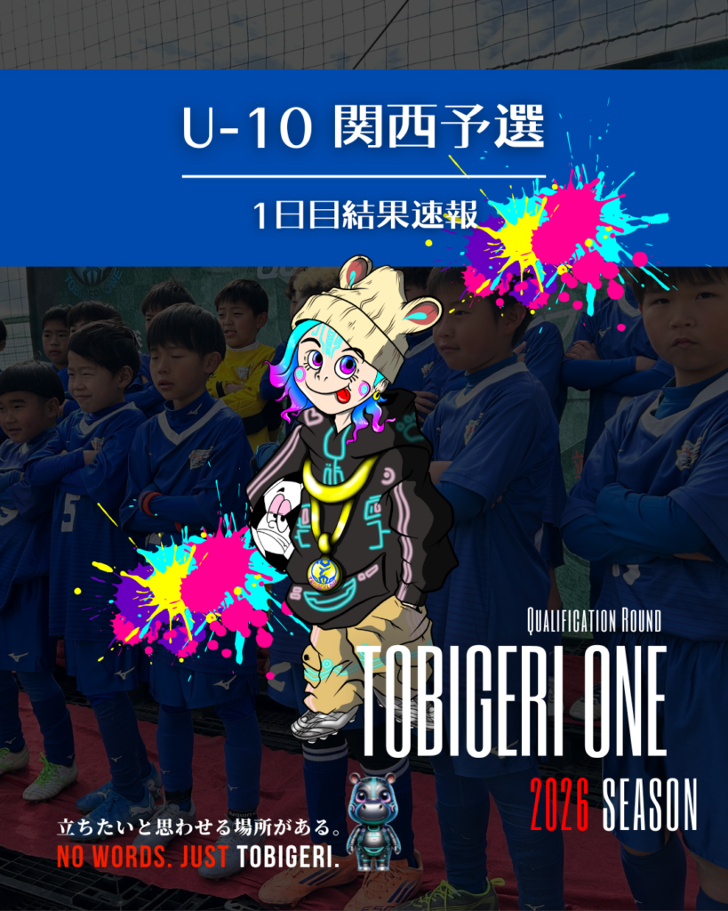 TOBIGERI ONE 2026 U-10関西予選 DAY1結果速報 2026年2月7日 お知らせ 初日試合結果 2026 U-10関西予選 各種SNSアカウント TOBIGERIオフィシャルショップはこちら \結果速報はX(旧Twitter)/ \選手たちのリアルな様子はInstagram/ \大会終了後はYoutube/ \おもしろ動画はTiktok/ \テキスト速報&イベントの裏側はThreads/ URL Copied!